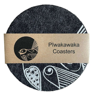 Introduce the charming piwakawaka (fantail) to your home with this elegant set of four Ecofelt Coasters. Rendered in fine detail against a sophisticated dark grey, each 100mm coaster captures the spirit of New Zealand's beloved native bird. Sustainably crafted from 100% post-consumer recycled plastic bottles, they're as kind to the environment as they are functional. Complete with a branded card bellyband for effortless gifting, these locally designed coasters make a meaningful present for nature lovers and design enthusiasts alike.