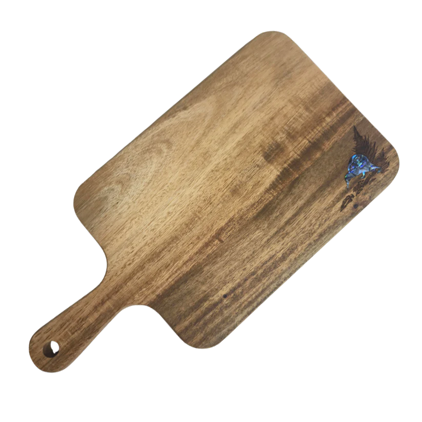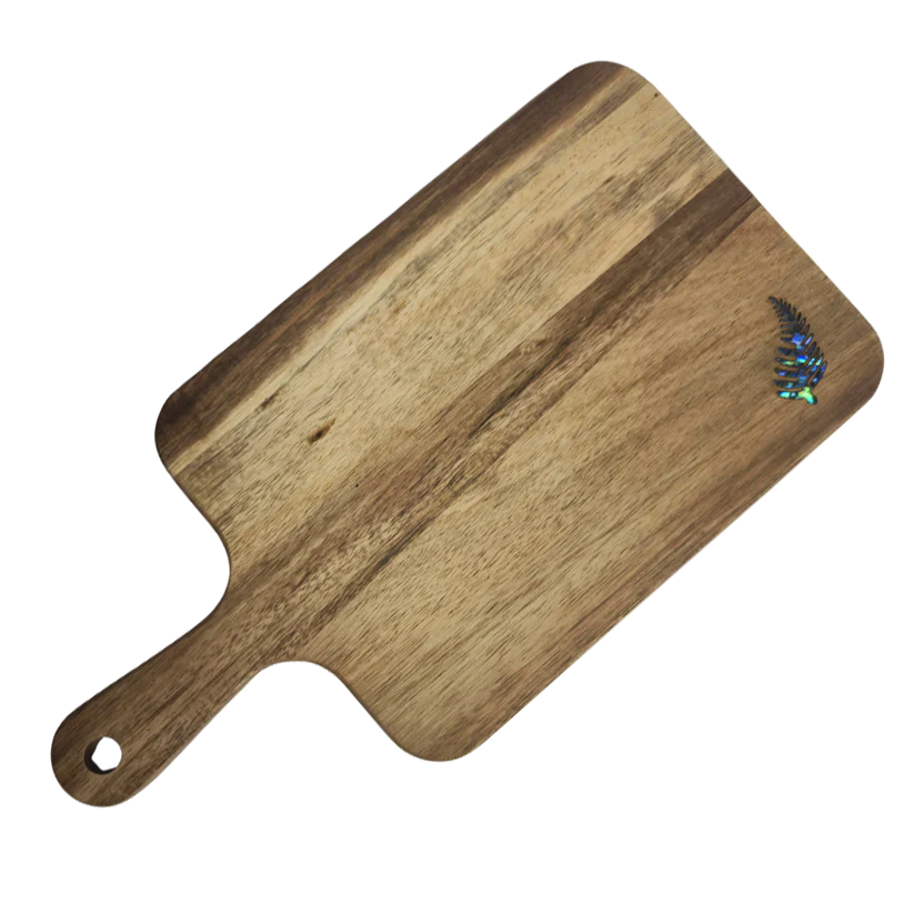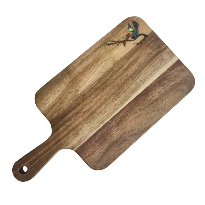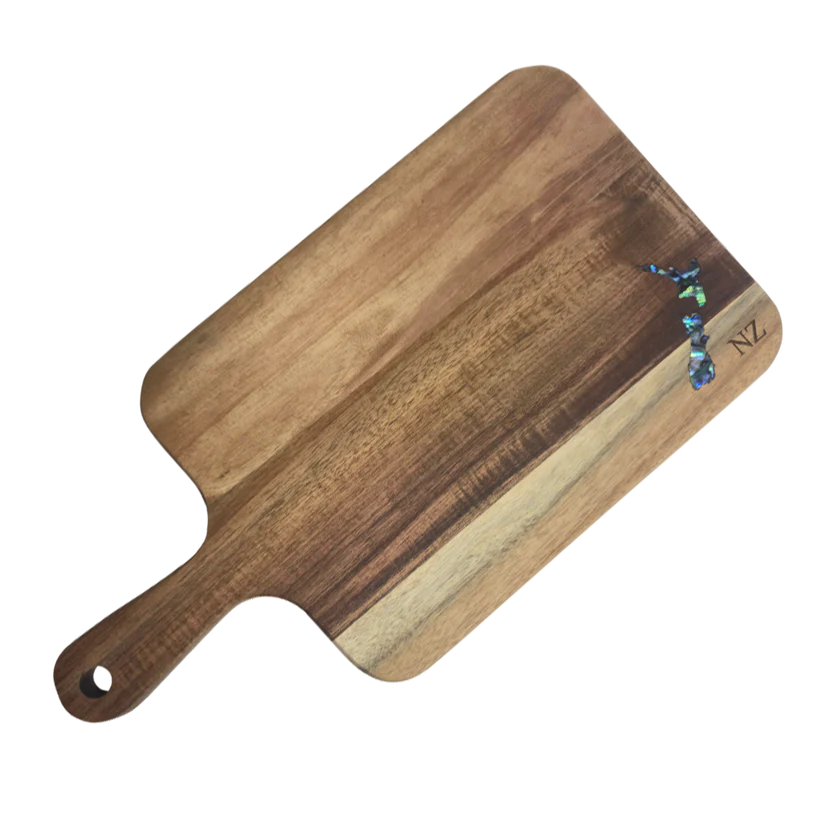 Serve in natural style with this handcrafted Paua Serving Paddle in Acacia wood. Each board is made from sustainably sourced acacia wood, showcasing its warm golden tones and striking natural grain.