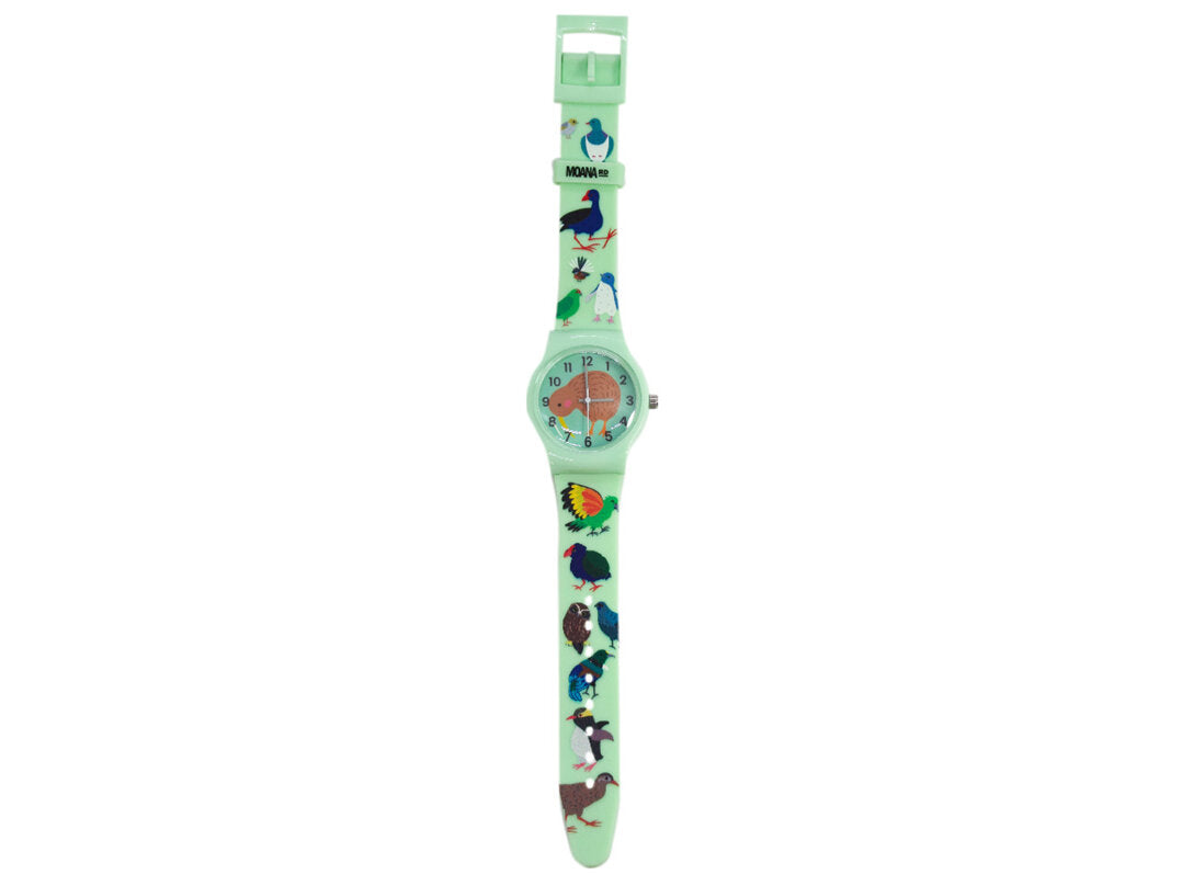 Kia ora! It's 3:39 PM NZDT on Thursday, 29 January 2026. Here's your product description: Introduce your child to timekeeping with style. This charming kids' watch by Moana Road celebrates beloved NZ native birds—Tui, Pukeko, and Kiwi—in bold, eye-catching colours that spark joy and curiosity. Built tough with water resistance up to 10m and a soft, comfortable buckle strap, it's ready for everyday adventures. The stainless steel case houses a reliable Japanese mechanical movement, while the lightweight design ensures all-day comfort. Perfect for young nature enthusiasts who love Aotearoa, this timepiece arrives beautifully gift-wrapped and ready to treasure.