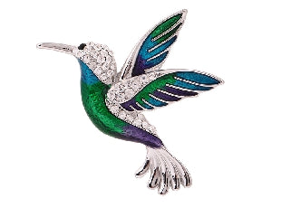 Boxed blue/green hummingbird rhodium brooch