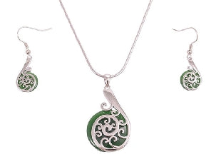 Honour New Zealand's most iconic symbol with this striking green resin silver fern pendant set. The 35x22mm centrepiece features a laser-etched silver fern design set in vibrant green resin, finished with rhodium plating for timeless elegance. Paired with 20x12mm matching earrings, this coordinated collection brings together modern craf