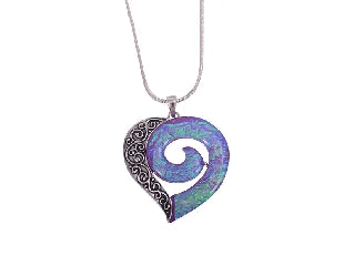 This boxed lavender koru-heart rhodium pendant measures 40x38 mm and makes a thoughtful gift. Its elegant design combines the koru motif with a delicate heart shape, symbolizing new beginnings and love. The rhodium finish adds a subtle shine and durability, ensuring it remains a cherished keepsake for years to come. Perfect for special occasions or as a meaningful present.