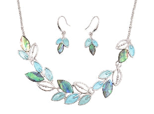 Blend natural beauty with contemporary style in this elegant paua and blue leaves necklace set. The centrepiece pendant measures 35x20mm, showcasing iridescent paua shell paired with striking blue accents in a leaf-inspired design, finished in refined rhodium plating. Complemented by 22x11mm matching earrings, this coordinated collection captures the essence of New Zealand's lush landscapes. A sophisticated gift for those who appreciate artisanal craftsmanship and the harmonious fusion of colour and cultural symbolism.