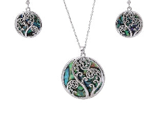 Boxed rhodium silver-fern paua round pendant set