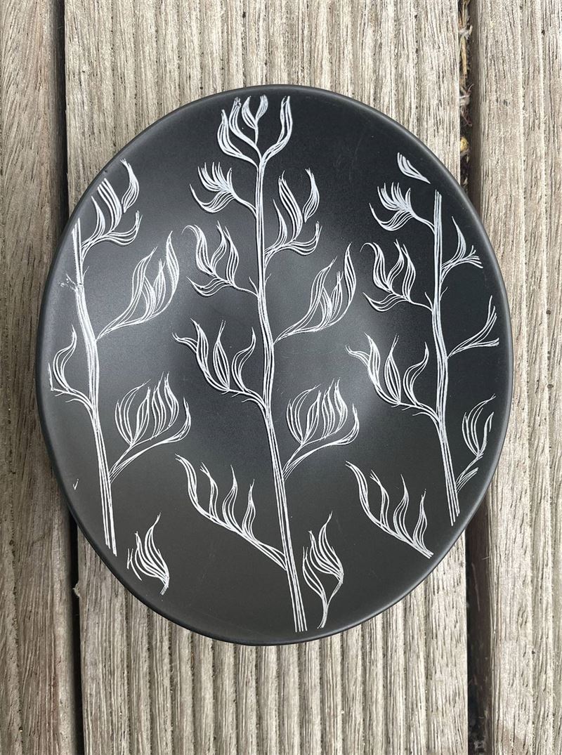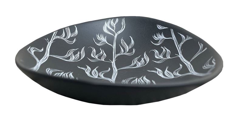 Striking porcelain bowl by Jo Luping featuring luminous white harakeke (flax) motifs against a bold black backdrop. This 10cm vessel celebrates the beauty of imperfection, with subtle variations in form that reflect its artisanal creation. Practical and durable—food-safe, dishwasher and microwave safe with a semi-gloss glazed interior and natural unglazed finish outside. Arrives in thoughtfully designed packaging complete with artist information and design narrative card. A sophisticated gift that honours New Zealand design and cultural artistry.