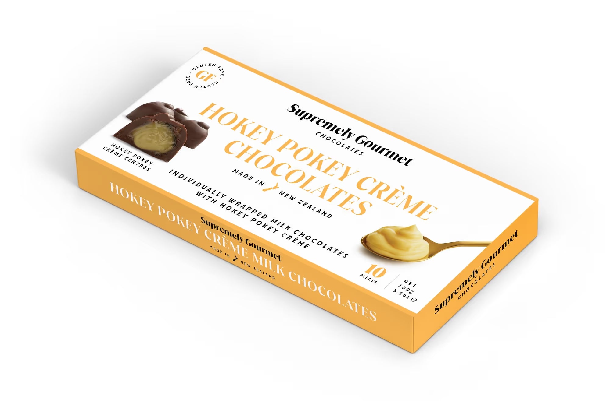 Celebrate a Kiwi favourite with ten individually wrapped milk chocolates infused with Hokey Pokey cream, presented in an elegant flat box. The nostalgic crunch and caramel sweetness of Hokey Pokey honeycomb blends seamlessly with smooth milk chocolate for an indulgent treat. Perfect for gifting to those who treasure classic New Zealand flavours and artisanal confectionery.