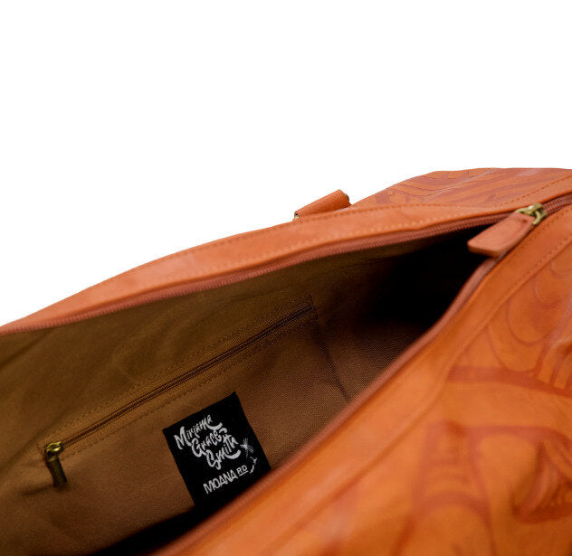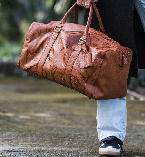 Escape for a night or a weekend with this stunning overnighter designed by Wellington artist Miriama Grace-Smith in collaboration with Moana Road. Crafted from durable vegan leather in a warm tan, this spacious bag features soft faux-leather carry handles and a detachable strap for versatile carrying. Lightweight yet robust, it's perfect for romantic getaways, festival trips, or adventure weekends across Aotearoa. A thoughtful gift for anyone who treasures time away and celebrates NZ culture—whether catching the Bledisloe Cup, exploring local food festivals, or enjoying a well-deserved break with friends. Designed with heritage and craftsmanship at its heart.