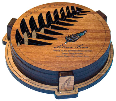 Handcrafted in New Zealand, this elegant coaster set features four 95mm Rimu wood pieces nestled in a matching Rimu holder. Each coaster shields your furniture from unsightly condensation rings and water marks, keeping surfaces pristine. The distinctive silver fern and paua design captures the essence of Aotearoa, making it an ideal gift for those seeking an authentic piece of home or a meaningful souvenir of New Zealand's natural beauty. Functional art that celebrates local craftsmanship.