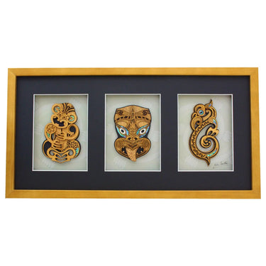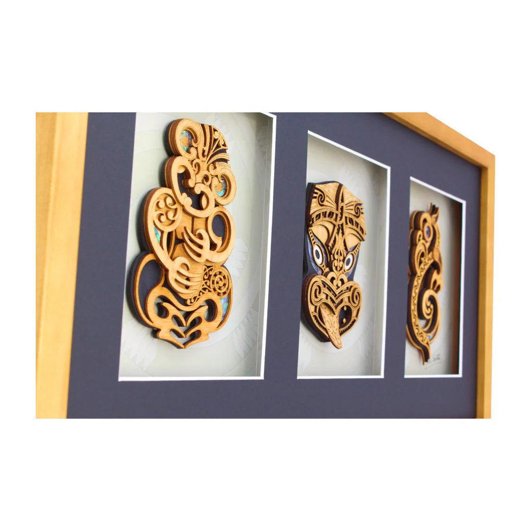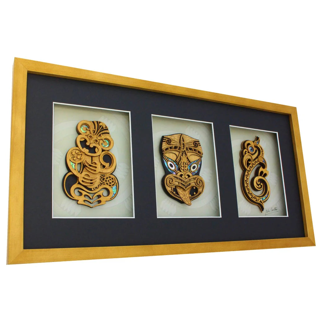 Celebrate Maori heritage with this Premium Large Triple Carving Maori Artwork featuring the iconic Tiki, Wheku, and Manaia designs. Expertly crafted from sustainable gaboon wood with laser precision, each piece showcases intricate detail and vibrant Paua inlay. Mounted on a subtle koru background with a black matte board and encased in a custom glass shadow box, it includes the artistβs signature, biography, and the rich stories behind each symbol. Measuring 560mm x 295mm x 33mm, it makes a thoughtful and meaningful gift.