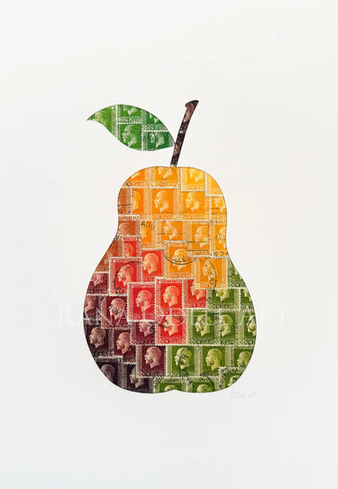 This "Pear" print by Rana Odell features a unique design created from real stamps. Printed on high-quality archival matte paper, it comes in A4 size, unframed, and protected in a cellophane packet with backing. Each print is hand-signed, making it a thoughtful and distinctive gift for art lovers.