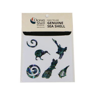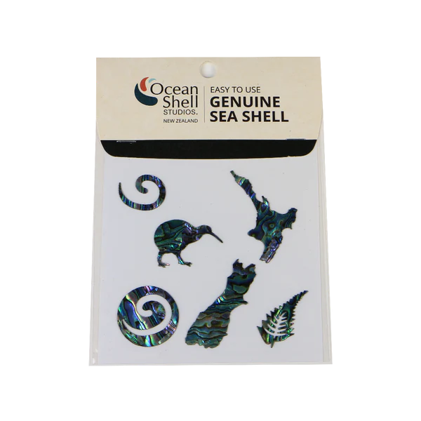 Enhance your crafts with this set of six pāua shell laminate stickers featuring iconic New Zealand shapes. Made from ultra-thin 0.5mm shell veneer with acid-free, peel-and-stick backing, these stickers add a natural shell finish without sanding or sealing. Perfect for cards, scrapbooking, and framed art, they adhere easily to smooth surfaces with light use. Each pack is retail-ready and individually packaged for easy display, making it a charming gift or craft store addition.